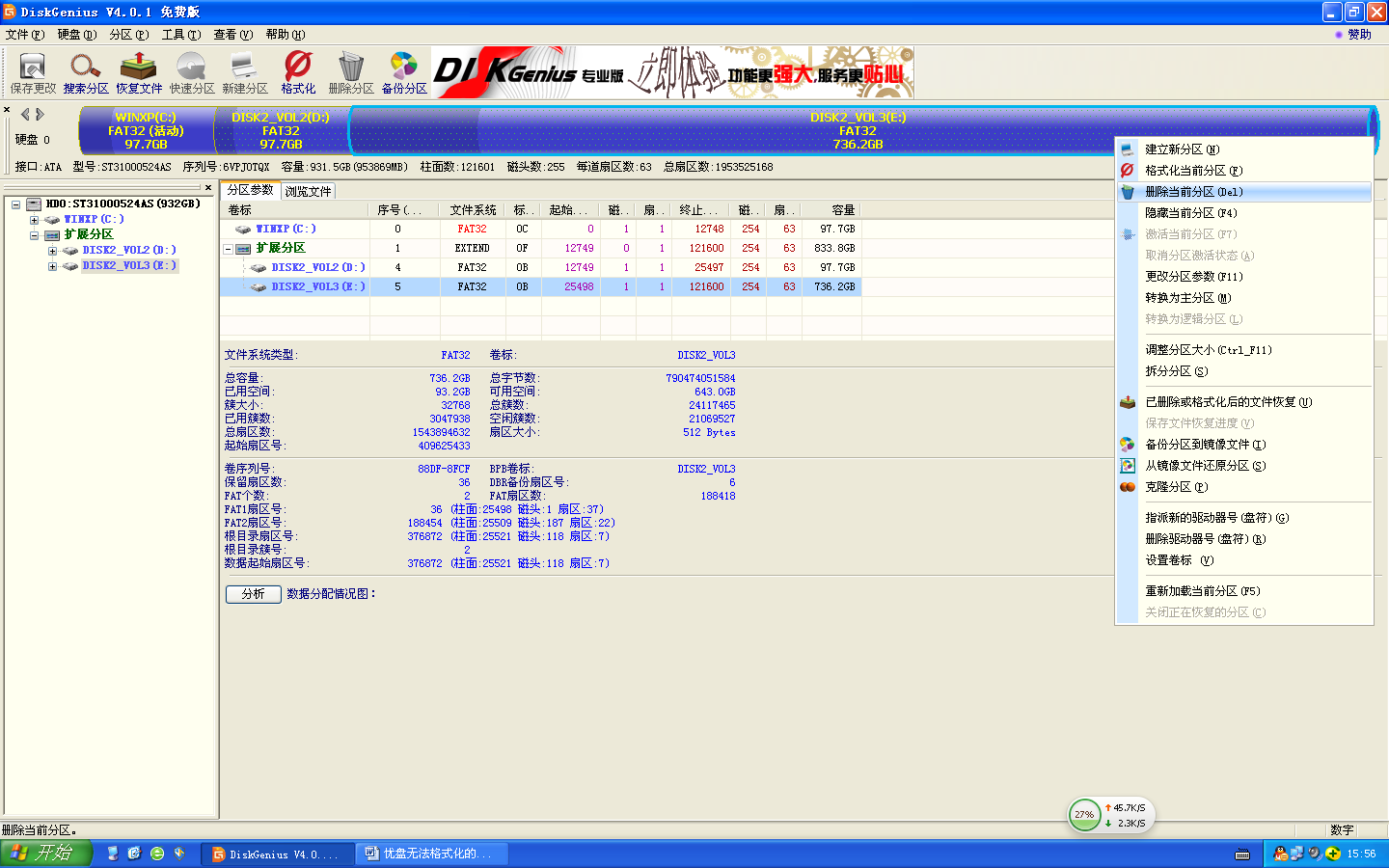 2.对着蓝色的部分点右键,然后选中删除当前分区
